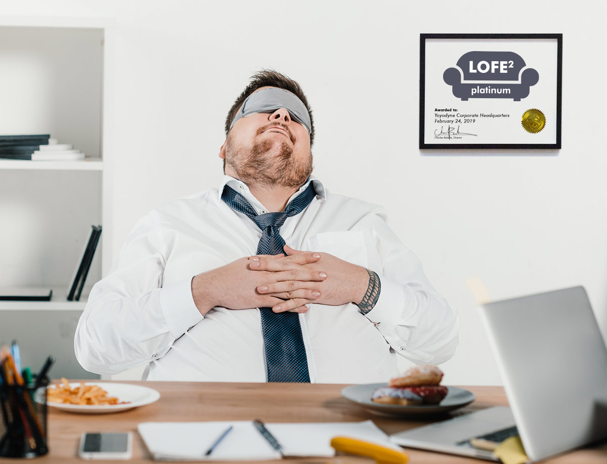 LOFE2 is about more than comfort and energy conservation, though: it is also about freedom, Slacker emphasized. Unlike WELL, LEED, and other certifications that “strong-arm architects and building owners into complying with onerous government regulations that restrict the use of high-value organic chemical (or ‘high-VOC’) solvents, proven flame retardants, antimicrobials, and stain-resistant compounds, LOFE2 encourages their use,” he says. “These products make employees feel safe and secure so they can sit comfortably on their foam cushions, be more productive, and focus on what is really important—corporate profits.”