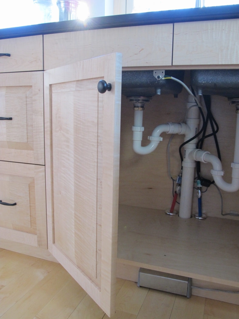 We brought down from the house we moved out of a great kitchen faucet control system made by TapMaster that lets you turn the faucet on an off by either pressing your knee into one of the under-sink cabinet doors or by pressing a toe plate with your foot. This way you can easily turn the water on and off while you’re washing a pot or rinsing dishes. There’s no reason to leave the water running, so moderate water savings can be achieved. It’s also a huge convenience!