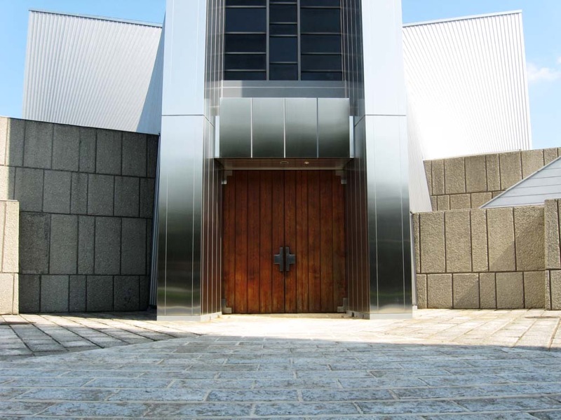 The entryway to the St. Mary's Cathedral in Tokyo features concrete, glass, and steel, and gives a wooden nod to traditional church doors. Is it beautiful? Does it look alive? Click photo to enlarge.