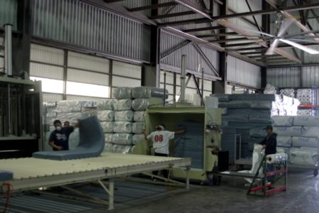 I've gotta say, I love visiting factories, especially those that make products I've been writing about for years. I just toured Bonded Logic's Chandler, Arizona plant, 20 minutes outside of Phoenix, where each month the company converts 300 tons of post-industrial recycled denim and other cotton fabric into the UltraTouch line of cotton insulation, sound-proofing materials, duct insulation, and related products. I never knew there was so much I didn't know about cotton insulation! Liz Obloy, the publisher of Sustainable Facility magazine, and I saw the manufacturing process first hand, from the bales of incoming raw materials to the packaging of finished product. This plant gets the cotton after it's already been fiberized — broken down into the constituent fibers. Bales of polyester and polyolefin "binder" fibers that give the material loft also come into the plant. The fiberized cotton is treated with a borate solution to make it resistant to fire, mold, mildew, and pests. All the fibers are then mixed in huge bins and a wide conveyor belt of these loose fibers then pass through gas-fired "bonding ovens" where the material is heated to about 350 degrees F. In the oven, the bonding fibers are activated in a way that holds the fibers together to produce batt insulation or higher-density sound-control panels.