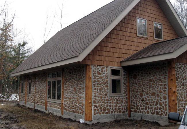 With smaller and stronger sticks, it's easier to design double-wall envelopes that use no more material than a conventional frame. In 30 years of building variations of double-wall houses, I have found that the most cost-effective, resource-efficient, labor-efficient, thermally-efficient, and hygrically sound wood-framed envelope is a modification of the Larsen Truss (which was developed for retrofits), which has become known as the Riversong Truss. My system uses a 2x4 inner load-bearing frame, stabilized with metal T-bracing, a 2x3 outer chord gusseted with 1x4s and supported at both foundation and rafter tails. Combination sheathing/siding of pre-finished novelty drop spruce (pattern #105) over housewrap, air-tight drywall inner skin and dense-pack cellulose fill completes the package.