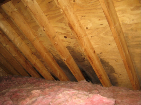 A home inspector told my client that this mold in her attic was the result of insufficient ventilation. But the pattern is targeted and distinct, not generalized throughout the attic. It sure looked like the result of an air leak to me, as indeed it turned out to be (read the case study)