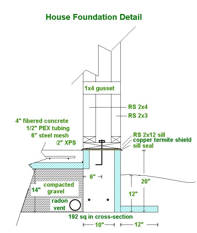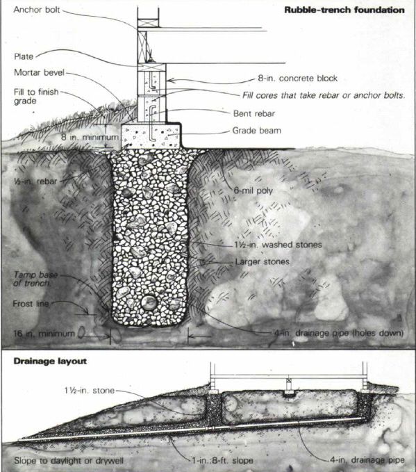 For these reasons, I have tended to prefer either rubble-trench foundations (à la Frank Lloyd Wright) or frost-protected shallow grade beams. The dramatic reduction in both excavation and concrete volume that these systems allow can justify the use of an insulated concrete slab if it has the multiple purposes of finished floor (tinting the mix is the least expensive way to do this), radiant heat source, and solar thermal mass storage. I use the rubble trench on wet or poorly drained sites and the frost-protected shallow foundation (FPSF) on flat sites with well-drained soils. The FPSF is now accepted in the international residential code and the design guide is downloadable through NAHB Research Center (toolbase.org).