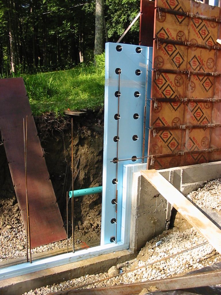 Other, less conventional foundation options that are available for consideration include the All-Weather Wood foundation (pressure-treated sills, framing & plywood on a crushed stone base), insulated pre-cast concrete walls (that require heavy shipping), and the increasingly popular Insulated Concrete Forms (ICFs). But the latter puts the foam in the worst possible location--both outside and inside, where it's vulnerable to all the potential dangers--and provides little dynamic thermal mass factor.