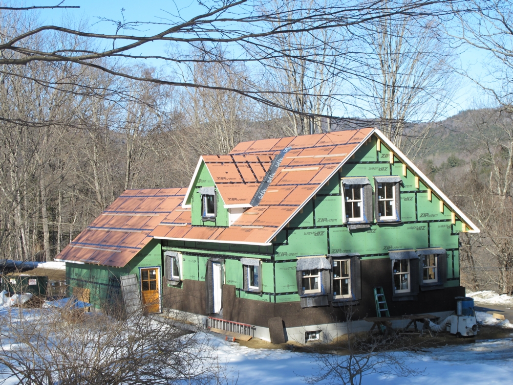 The building enclosure is designed so that the cavity-fill insulation layer can dry to the interior (if it ever gets wet), while the cork can dry to the exterior. On the outside of the cork will be a layer of housewrap (a high-performance German product, Pro Clima Solitex, distributed by 475 High Performance Building Supply), vertical strapping to create a rainscreen, and wood clapboard siding.