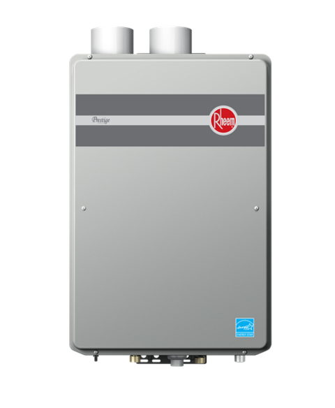 Rheem's Prestige condensing tankless water heater has an efficiency of 94%, 11,000 to 199,000 Btu/hour gas input, a maximum hot water delivery (at a 45°F temperature rise) of 8.4 gpm</strong><strong><strong>, and a minimum flow rate of 0.26 gpm.