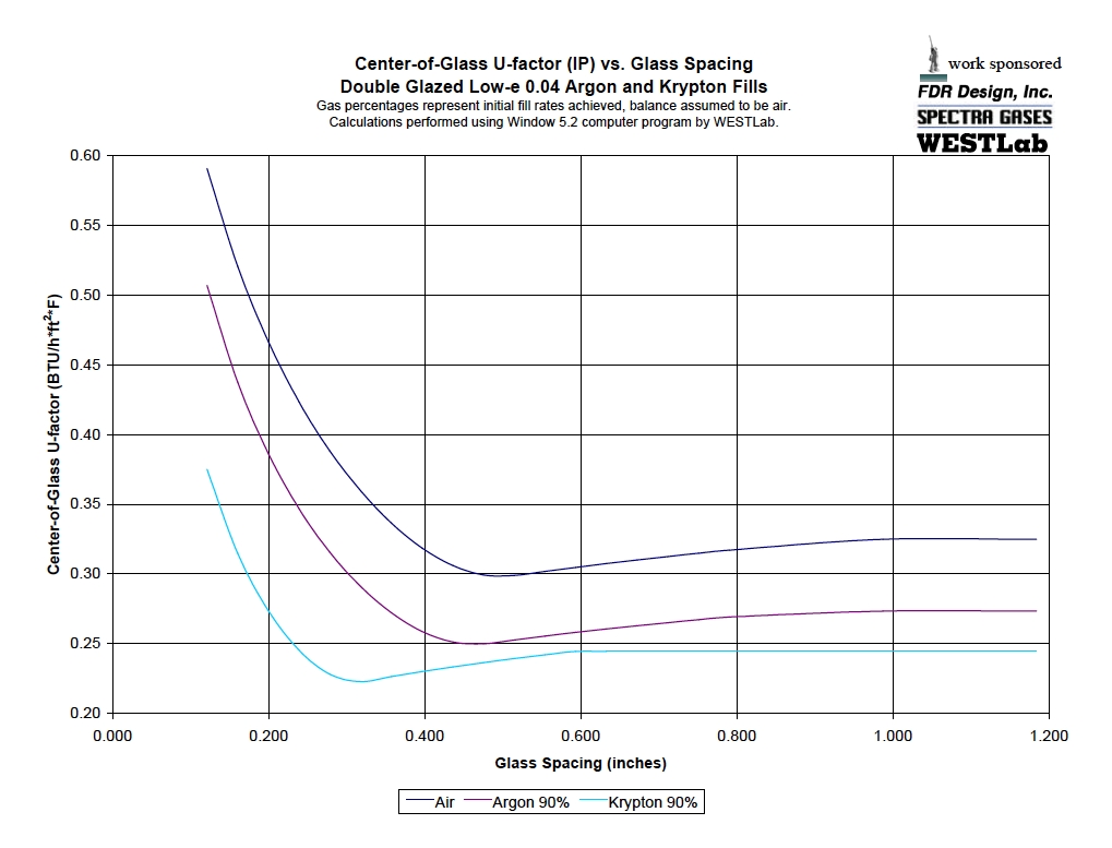 A chart from FDR Design, Inc. showing the impact of gas fills and the spacing between the layers of glass in an IGU. Graphic: FDR Design, Inc. Click on image to enlarge.