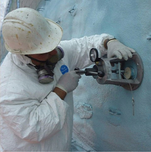This adhesion test is quality control assessing the bond between the installed foam and the substrate. Adhesion tests like this can be done prior to the installation as part of project assessment and done during or after job completion.