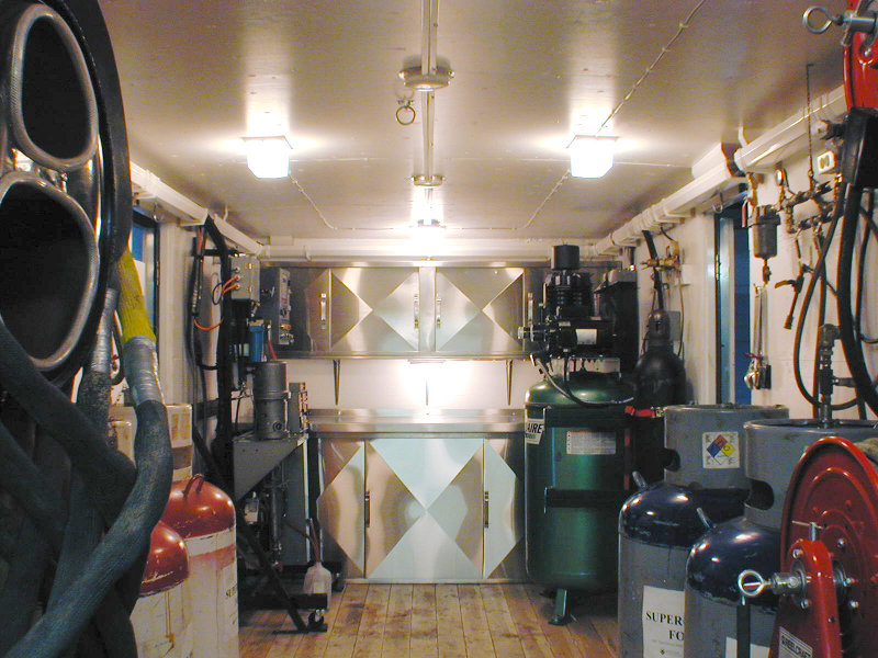 This mobile spray rig is setup in a box truck and looks more like a lab than a piece of jobsite equipment. Set up this way, the box can be climatized as needed. Note the setup includes ratio, usage, and temperature monitor with auto shut-off.