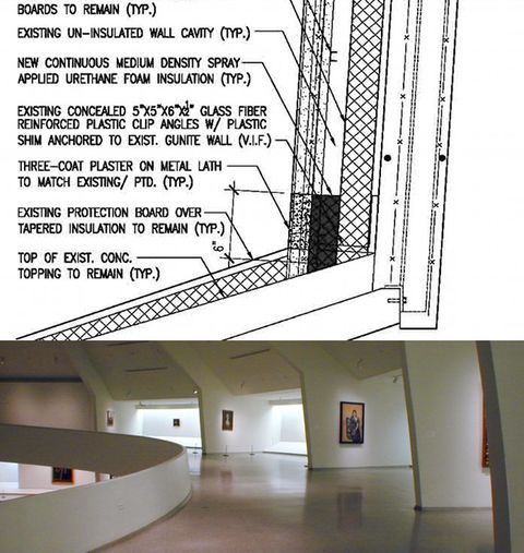 The striking rotunda of the Frank Lloyd Wright Guggenheim museum in New York City places all of the art in concave exhibition niches on the exterior of the building. The sloped floor and wall junction created a void and thermal bridge at this junction (see detail and photos below), which led to moisture and discoloration problems on the interior.