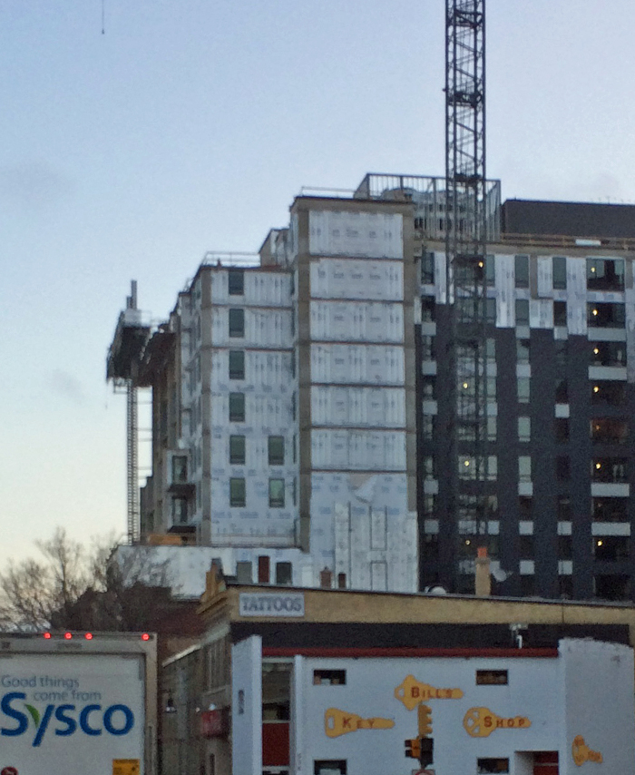 On our way from a UW-Madison parking lot to the commissioning course location — The Pyle Center — my brother and I noted the irony of the torn housewrap flapping in the wind (just to the left of the crane, 7th floor down from the top) on this Madison building under construction.