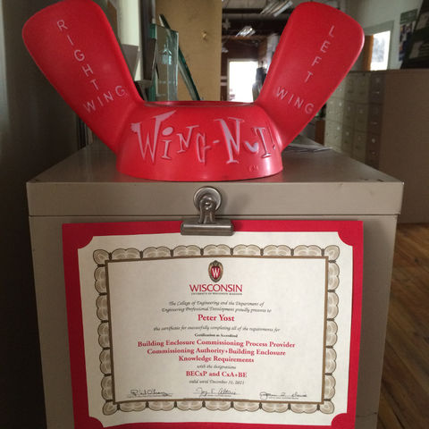I could not resist taking this picture. As I was sitting at my desk writing this blog, I glanced up to see my “posted” BE Cx certificate just under my wingnut hat (essential gear for our Wingut Test Facility). Always important to maintain a balance and a sense of humor in one’s work…