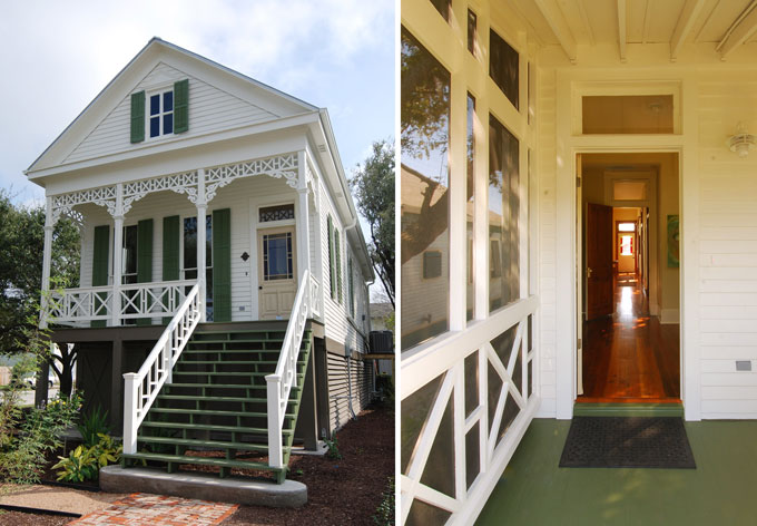 Damaged by Hurricane Ike in 2008, this 19th-century house in Galveston, Texas, was moved, elevated, and renovated to LEED Platinum standards. In addition to insulation, solar panels, and rainwater cisterns, the house features natural ventilation via operable transom windows and a restored breezeway. Photos: Galveston Historical Foundation