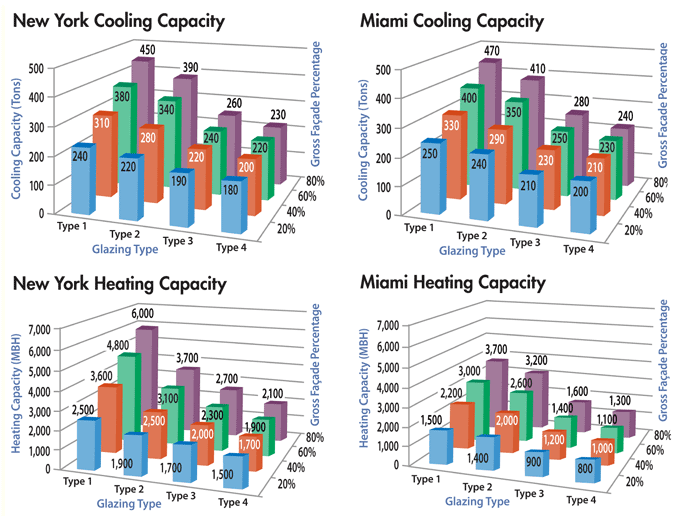 These graphs show the impact of different glazing types and glazing percentages on peak cooling load (in tons) and peak heating load (in million Btus per hour) for New York and Miami. A square building footprint is assumed. Type 1 is single glazing. Graphs created by Amie Walter based on Arup data. Click on image to enlarge.