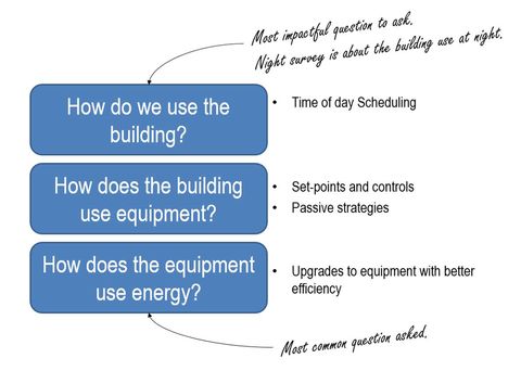 “Tonight we’ll be focused on how we use this building,” Paquette says. “There are always ways to learn more about energy use and how we might adapt that use.” Paquette places the night survey in context with a simple graphic (see Image 1).