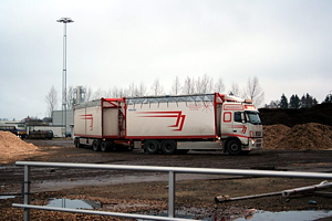 The VEAB plant is almost entirely powered by wood chips — using 60 of these tandem tractor-trailer loads per day during peak operation.
