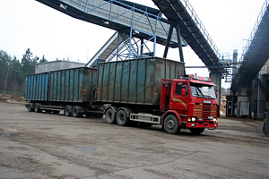 Wood chips arrive by tandem tractor-trailer truck; the C4 plant uses 18-20 loads of chips per day during the peak heating season.