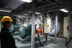 C4 Energi CEO Göran Thessén standing in front of several large motors that power the pumps circulating hot water through the district heating network.