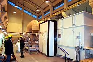 Power generation components in the C4 plant. The square unit on the right is the electric generator, and the unit with black corners and door houses the gearing that converts the steam turbine's high-speed shaft rotation to a more moderate speed for use by the generator.