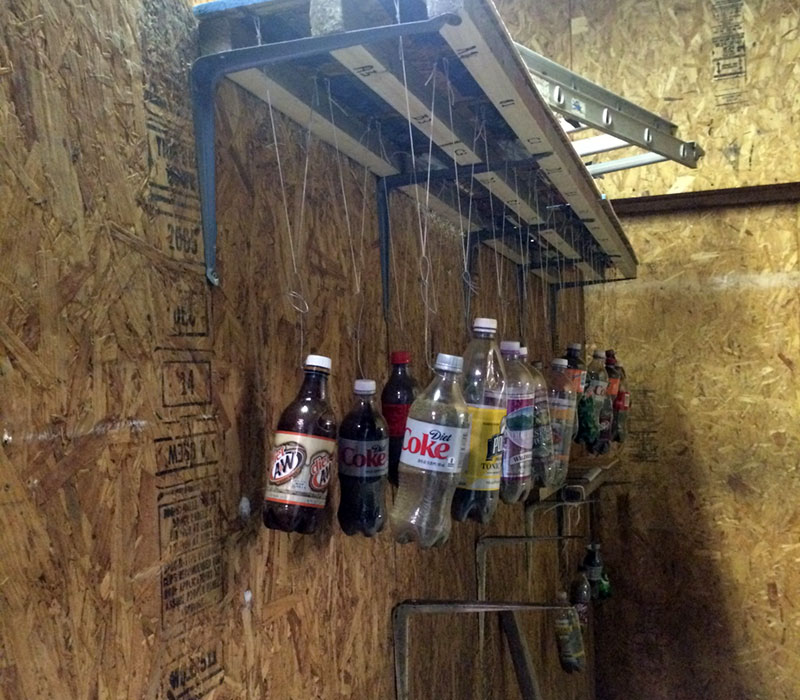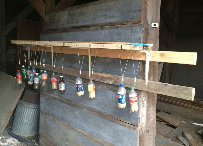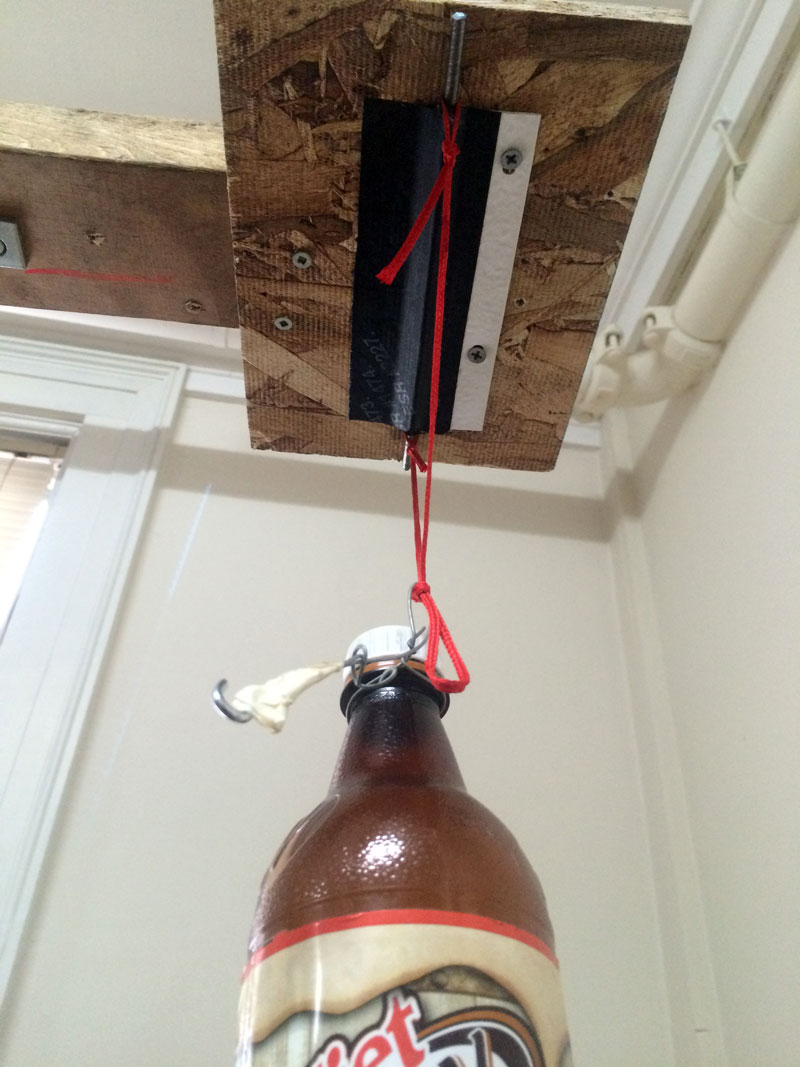 We set up two samples of each per the test conditions described below. Each bottle weight connects to the string loop with a hook so that all the weights can be easily removed/unloaded.