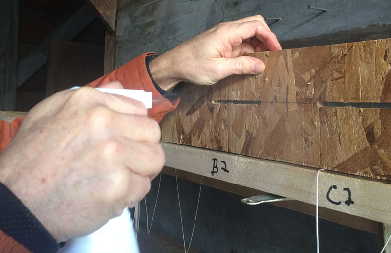 Graph 1 shows how all the tapes held until we moved them from the sheltered workshop to the outdoor shed. It shows the temperature in the shed (black line), the % relative humidity (blue line), and the drops (except the latest drop on March 16, 2016 of B3).