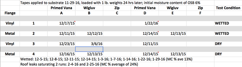 NOTE: Two samples of each brand of tape were periodically wetted, and two were not. Each tape type was tested on both PVC and aluminum flanges.