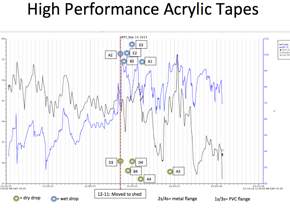 These results surprised me; I was convinced that the European “solid” acrylic tapes would perform better in high-moisture conditions, but at least in our limited testing, ZIP System tape did better, at least to date for winter conditions.