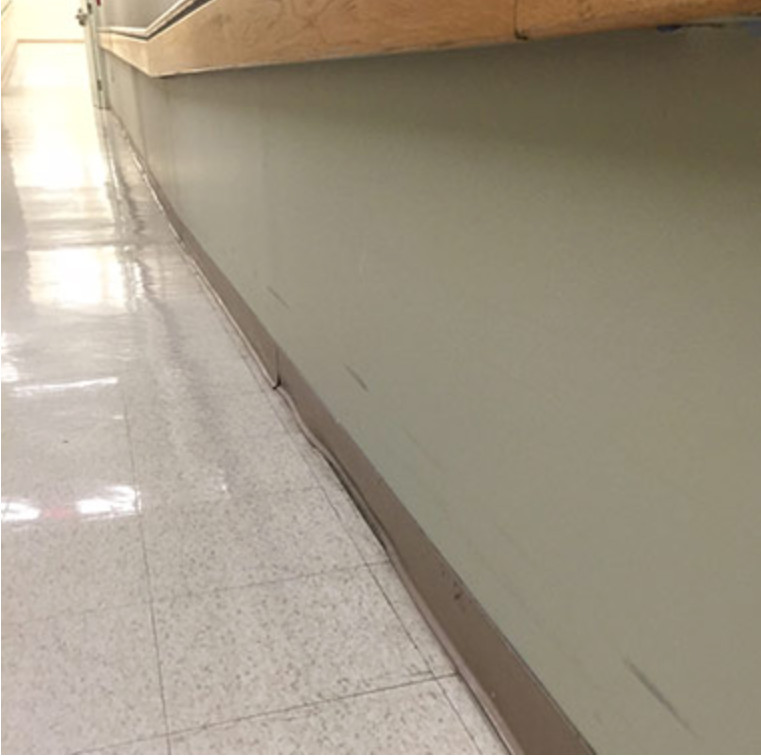 Durability: Since the face of the VersaDry track fully supports the baseboard, it protects the baseboard from “caving” when impacted, as when buffing machines slam up against it (see Image #4, a photo that Doug took at a hospital that is only 6 months old).