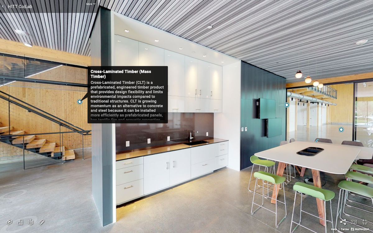 HITT Contracting Created as a space for researching innovative green building technologies, Co|Lab was the first mass timber project built in Virginia. The virtual tour allows users to see the floor plan or a “dollhouse” view, and to do a 3-D virtual walkthrough. There is even a measurement tool so you can get a sense of the dimensions. For a more immersive experience, the tour includes a virtual-reality option.