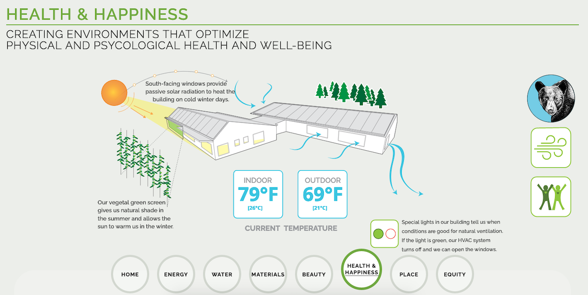 Hitchcock Center for the Environment It’s not exactly a building tour, but this cool widget from the Hitchcock Center for the Environment illustrates green building features categorized by Living Building Challenge petal.