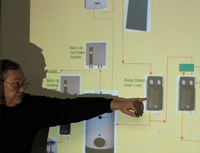 Jack Mann, the presenter, has six panels on his own roof and the rest of the necessary gear in his basement for heat and domestic hot water for his 2,500 ft2 Rhode Island ranch. (It's interesting to note that the supply and return pipes between the storage tank and the rooftop array are corrugated [flexible] stainless steel.) In Jack's case, the system reduced their oil consumption by 70% while also providing heat for their pool, and for melting snow in the winter. If you don't have a swimming pool to displace the excess heat in the summer, you'll need to get creative. Nobis has options, all of which involve some form of heat sink. It's a shame it can't be stored for long-term use (or sold to your neighbor). He did say you could add more tanks—a typical installation has 270 gallons of storage. Another option is wrapping the foundation with PEX. If you really wanted to go all out—and this is not a Nobis project, but was mentioned by someone attending the presentation—you could do what they did at Drake Landing Solar Community in Alberta, Canada, which is to flow excess heat into a borehole thermal energy storage system. See EBN coverage Stored Solar Heat Warms Alberta Development and Solar Thermal District Heating Comes to North America. Andy Cay, a proponent of net zero energy homes and president of the local Habitat for Humanity chapter, also attended the presentation. He mentioned a nearby Habitat house built this year that uses long term storage of solar heat. Basically, solar panels direct heat into PEX buried in eight feet of sand in a superinsulated container below the basement slab during the summer, with the hopes of storing 4-5 million Btus that will be tapped during the cold Vermont winters. Stay tuned for the results. Getting back to Nobis, the payback for a system like Mann's—which costs between $16,000 and $25,000—is five to eight years. A few years ago, the payback period would have been substantially longer. It goes without saying that the recent spike in the price of oil helped shortened the payback period.Back to Mark: It also should go without saying that these sorts of systems work best as part of an overall strategy that includes heavily insulated, tight envelopes and appropriate footprints. And one more thing to chew on: our fearless leader Alex Wilson, in his book Your Green Home, characterizes radiant-floor heating as "a great heating option for a poorly designed house." A full-out radiant floor system, he argues, is overkill for a super-efficient house, which could be heated with a point-source heater or two. And in a well-designed, well-built home, the romantic warm-foot thing touted for radiant floors won't happen without overheating the place. Read the EBN feature, Radiant-Floor Heating: When It Does—and Doesn't—Make Sense." Check DSIRE—the Database of State Incentives for Renewables & Efficiency—to find information about state, local, utility, and federal incentives for purchasing and installing renewable systems.