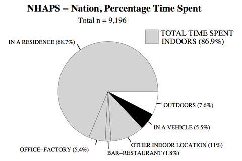 There are limits to the study: it may not take into account some populations that spend a high proportion of time outside. As the study states, “Those who were away from a home for extended periods (e.g., on vacation or homeless) were not included in the survey. These individuals may be more likely than those who were at home to spend large quantities of time outdoors. On the other hand, there may be positive bias due to neglecting institutionalized and/or hospitalized individuals,” who are indoors 100% of the time.
