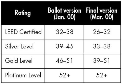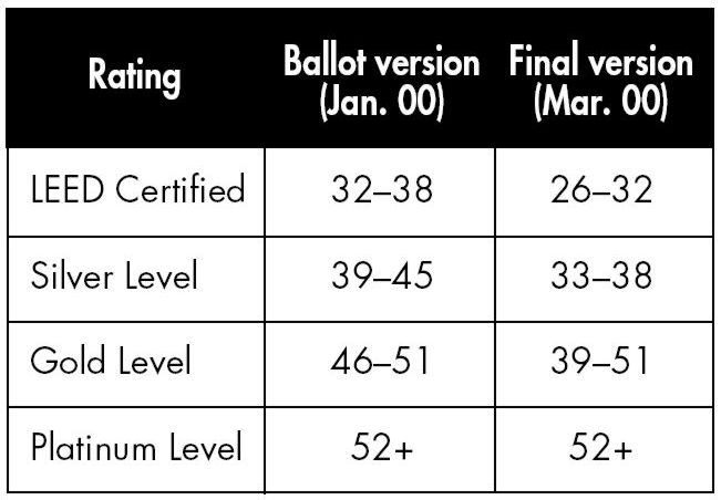 By lowering the bar for all but the platinum level, the Council has cast a much wider net for buildings that might qualify for at least a “LEED Certified” rating. Designers and owners who wish their buildings to stand out in the field may now have to go for at least a gold rating. This last-minute change may strengthen the program by allowing more buildings to participate. It also reflects a weakness in the process, however, in that this fairly substantial change was made without input from, or even notification of, most Council members. We hope that, as the Council matures, it learns to be more respectful of the demands of a true consensus process.