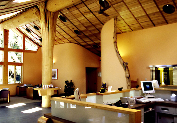 The Bank of Astoria in Manzanita, Oregon, designed by architect Tom Bender with SERA Architects, Inc., makes extensive use of natural materials.