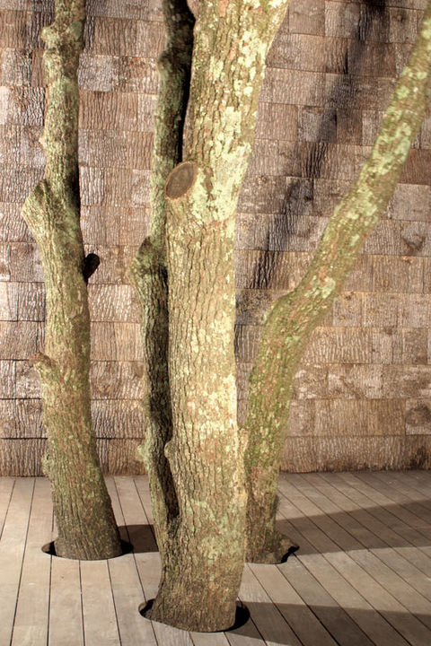 Live oak trees extend through the deck of an internal courtyard at the Sasanqua Spa in Kiawah Island, South Carolina, designed by Clodagh Design in New York City. Siding on the wall is made of natural bark.