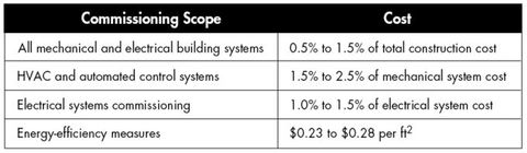 Source: Portland Energy Conservation Inc., as published in Building Commissioning Guide, version 2.2, from the U.S. General Services Administration and the U.S. Department of Energy, July 30, 1998. The cost of building commissioning varies greatly depending on the scope and duration of services, complexity of the building, and nature of the contractual relationships (see table). For a thorough commissioning service, Altwies estimates a cost of 2% to 3% of the cost of the systems being commissioned.