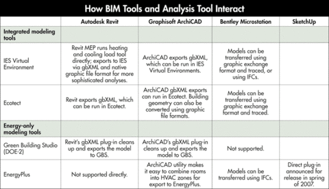 Kennedy has created plug-ins for Autodesk’s Architectural Desktop and ArchiCAD that assist users in defining HVAC zones and validating the BIM model to increase the chances that the energy simulation will provide useful results. This capability is integrated into Revit, so no plug-in is required. The software generates a file in gbXML format (an information exchange protocol developed by GBS) that the software uploads to GBS’s server for analysis. Minutes later, the designer can download the results of the model. GBS allows users five free runs; more runs are available for a nominal fee. GBS recently introduced a “design advisor” service that automatically generates proposed modifications to the design and allows users to experiment with a small number of alternatives. GBS also makes its DOE-2 input file available for download, offering engineers a shortcut for running their own early-stage energy models.