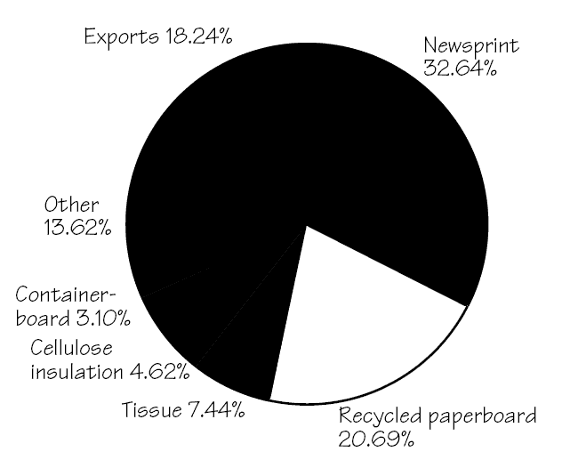 According to CIMA, 414,000 tons of cellulose insulation were produced in 1990. Because the finished product is approximately 80% recycled newspaper by weight, this means that cellulose insulation currently provides a use for roughly 330,000 tons of old newspaper. This represents 4.6% of total recycled newspaper (see pie chart). On a volume basis, EBN estimates that cellulose currently has about 10% of the fiber insulation market (fiberglass, mineral wool, cellulose). Increasing the market share of cellulose insulation—and thus increasing the use of recycled newspaper—will further strengthen markets for recycled newspaper, which will improve the economic viability of recycling programs. (Today, municipalities often have to pay to get rid of the newspaper they collect through recycling because the markets for recycled newspaper are so weak.)