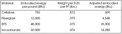 The only estimates of embodied energy in cellulose insulation EBN found were from Canadian manufacturer Therm-O-Comfort Co., Ltd. In a 1991 letter to the Canadian Standard Association, Therm-O-Comfort estimated primary energy consumption for cellulose insulation to be 85 kWh/ton (145 Btu/lb.). This figure does not account for the fire-retardant chemicals or transportation energy. Relative to most industrial processes, borax mining and refining is a “low-energy” process. Even with a conservative (high) estimate for fire retardants, embodied energy for cellulose insulation would be only about 750 Btu/lb. This figure is less than one-seventh the energy used to produce fiberglass, and one-30th that required for polystyrene (see table).