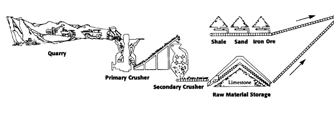 Cement production requires a source of calcium (usually limestone) and a source of silicon (such as clay or sand). Small amounts of bauxite and iron ore are added to provide specific properties. These raw materials are finely ground and mixed, then fed into a rotary cement kiln, which is the largest piece of moving industrial equipment in the world. The kiln is a long, sloping cylinder with zones that get progressively hotter up to about 2700°F (1480°C). The kiln rotates slowly to mix the contents moving through it. In the kiln, the raw materials undergo complex chemical and physical changes required to make them able to react together through hydration. (See illustration, pages 8-11.) The most common type of cement kiln today (accounting for 70% of plants in the U.S.) is a