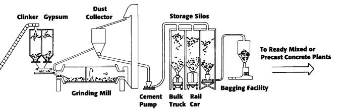 clinker. The clinker is then ground to a fine powder, a small amount of gypsum is added, and the finished cement is bagged or shipped bulk to ready mix concrete plants.