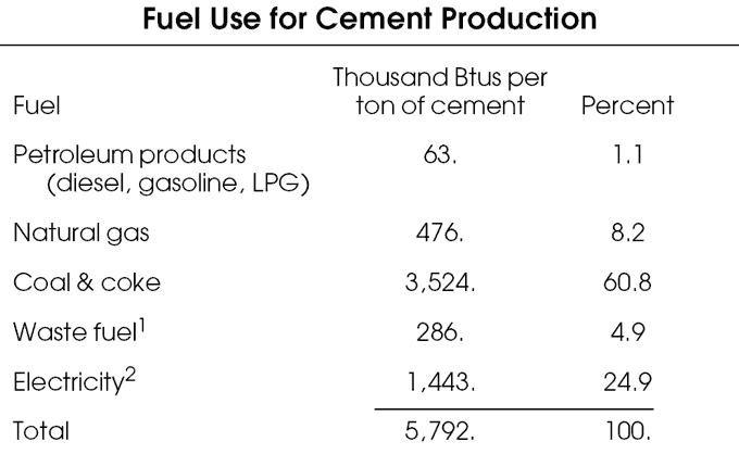Energy consumption is the biggest environmental concern with cement and concrete production. Cement production is one of the most energy intensive of all industrial manufacturing processes. Including direct fuel use for mining and transporting raw materials, cement production takes about six million Btus for every ton of cement (Table 2). The average fuel mix for cement production in the United States is shown in Table 3. The industry’s heavy reliance on coal leads to especially high emission levels of CO