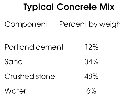 The water, sand, and gravel or crushed stone used in concrete production in addition to cement are also abundant (typical proportions of a residential concrete mix are shown in Table 1). With all of these raw materials, the distance and quality of the sources have a big impact on transportation energy use, water use for washing, and dust generation. Some aggregates that have been used in concrete production have turned out to be sources of radon gas. The worst problems were when uranium mine tailings were used as concrete aggregate, but some natural stone also emits radon. If concerned, you might want to have the aggregate tested for radon.