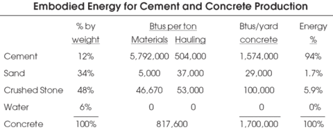 Energy use for concrete production looks considerably better than it does for cement. That’s because the other components of concrete—sand, crushed stone, and water—are much less energy intensive. Including energy for hauling, sand and crushed stone have embodied energy values of about 40,000 and 100,000 Btus per ton, respectively. The cement, representing about 12% of concrete, accounts for 92% of the embodied energy, with sand representing a little under 2% and crushed stone just under 6% (see Table 2).