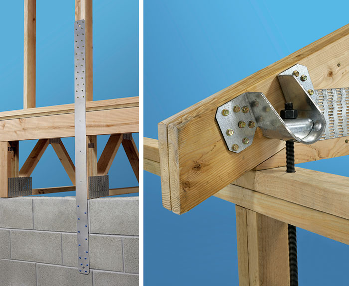 A wide variety of hardware is available for increasing resistance to strong wind. These products from Simpson Strong-Tie extend the load path in wood-frame construction, helping prevent uplift.