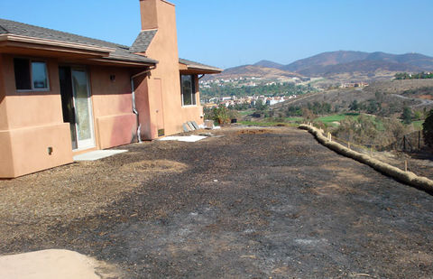 Although vegetation around it burned, this Rancho Santa Fe house, north of San Diego, survived the 2007 wildfire with only minor damage through careful design, materials selection, and landscape management.