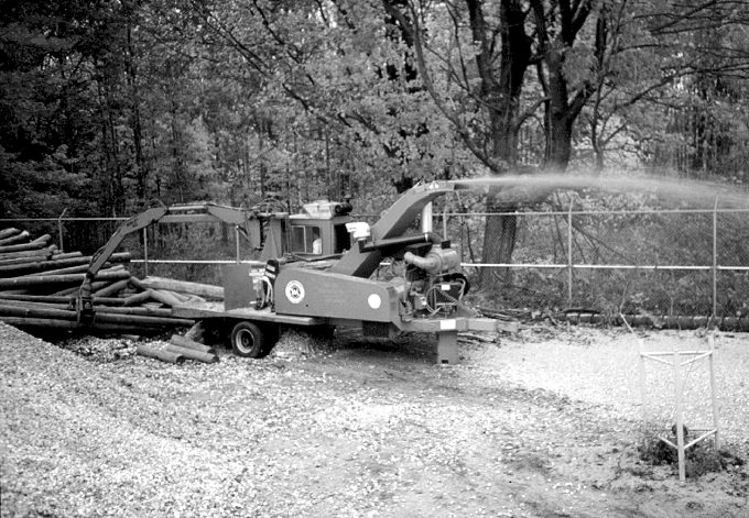 Due to the heavy use of treated wood poles by utility companies, the Electric Power Research Institute is participating in research on disposal options. Here CCA-treated utility poles are chipped for a test burn in a wood-fired power plant.
