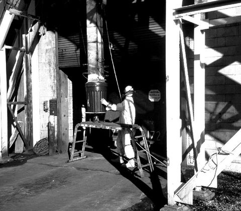 A hazardous waste technician collects an ash sample from a test burn in a wood-fired power plant that included some CCA-treated wood.