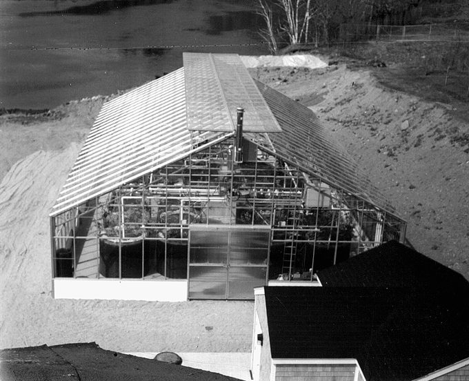 This photo of the greenhouse containing the Bear River, Nova Scotia Solar Aquatics facility was taken before the area was landscaped. Completed in 1995 by Ecological Engineering Associates, this system can treat 17,500 gallons per day (66,000 l/d), with likely expansion in the future.