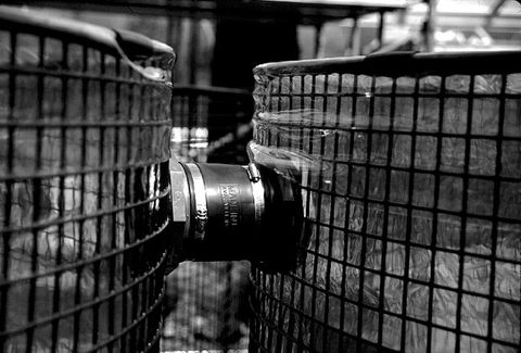 EEA solar tanks are now built using welded wire and clear PVC liners, which fill the cylindrical wire cage. Here a pipe connects two tanks.